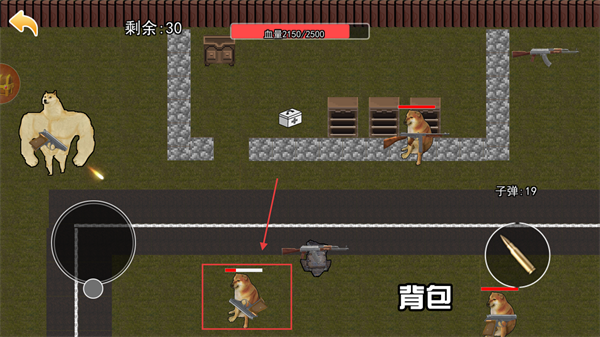 2、战斗时控制角色移动,用【武器】射击敌人,收集【子弹-19】补充弹药,注意保持【血量-150-2500】安全。