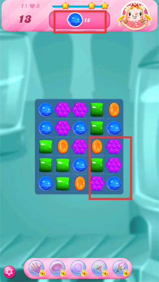 2、在关卡中,根据目标(如收集12个蓝色糖果),通过交换相邻糖果,使同类型糖果连成3个及以上进行消除,优先消除目标糖果。