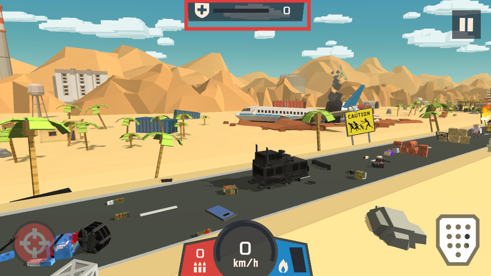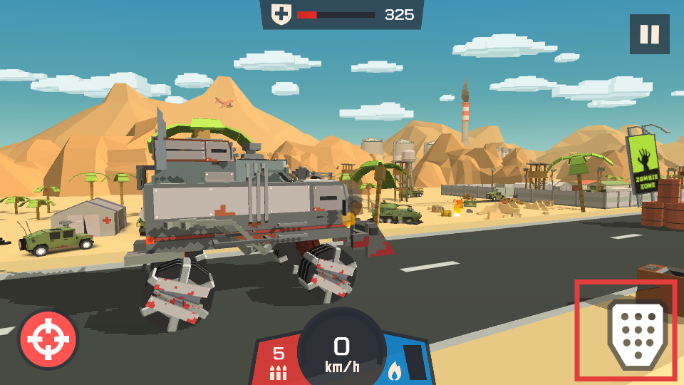 2、通过右侧的【操作按钮】控制战车加速,在道路上行驶,躲避障碍物和僵尸。