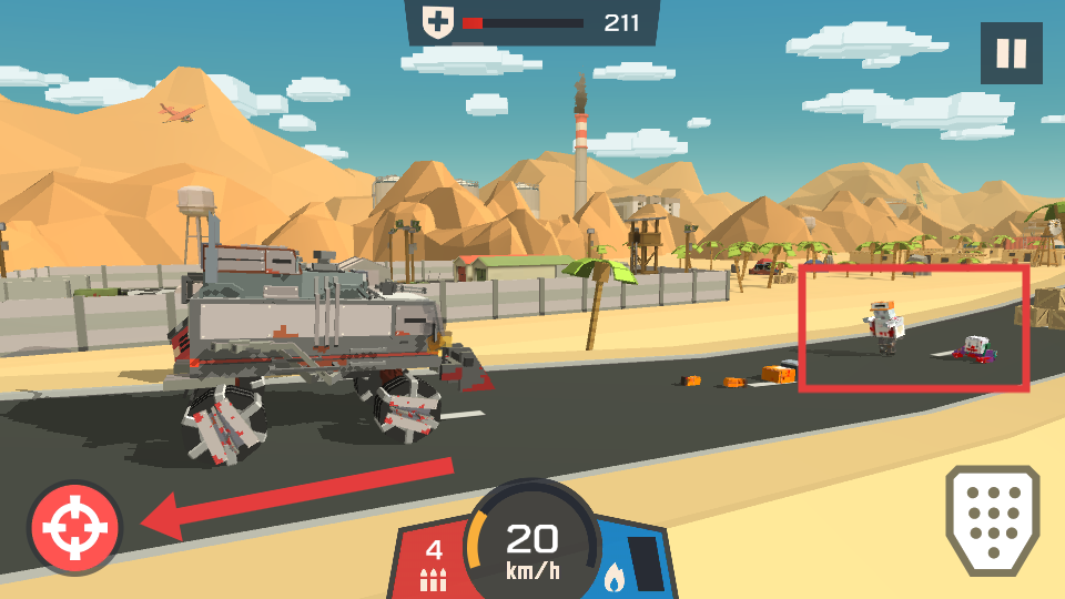 3、遇到僵尸车辆等敌人时,使用左侧的【攻击按钮】进行射击,消灭敌人,获取资源。
