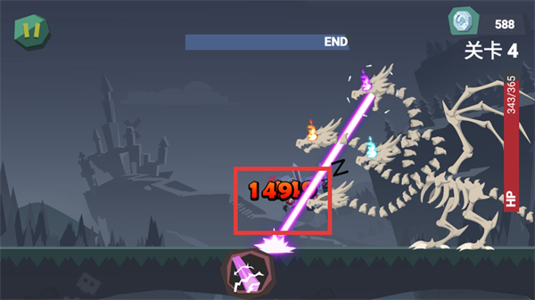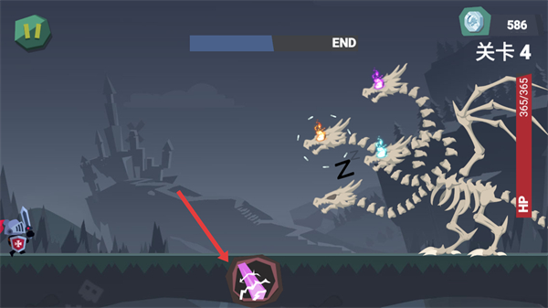 2、在关卡4中,触发红色箭头指向的紫色技能区域,释放技能攻击敌人。