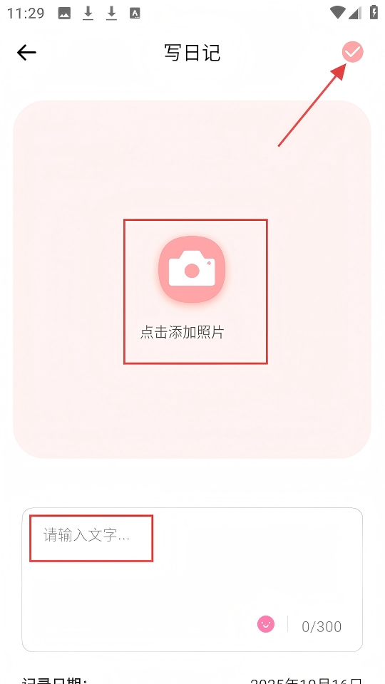 4、在【写日记】页面,添加照片并输入文字后,点击右上角的对勾按钮,完成日记记录。