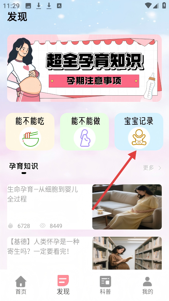 2、在【发现】页面,点击【宝宝记录】按钮,进入宝宝记录页面。
