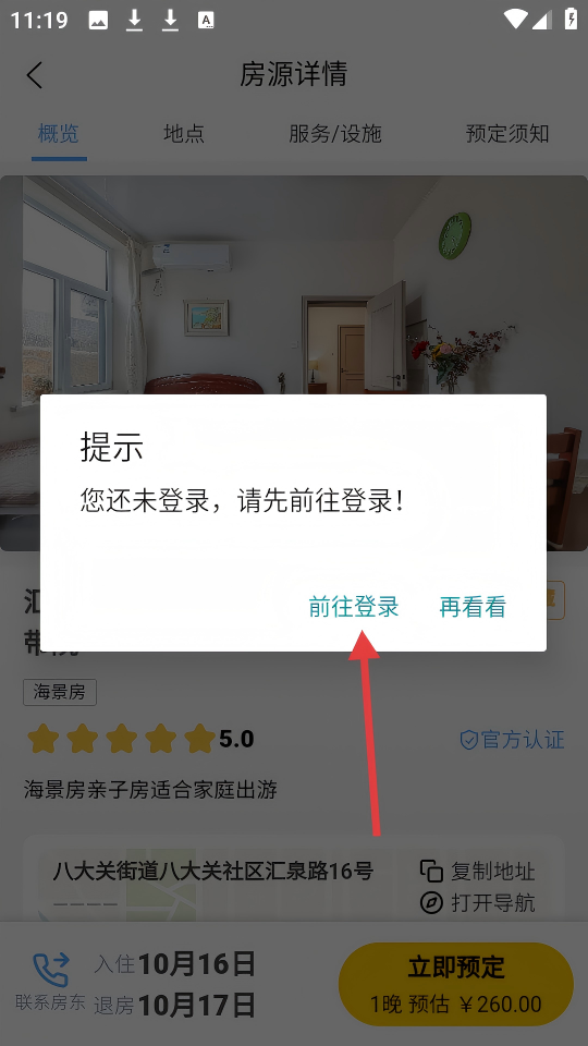 4、点击【前往登录】按钮,登录后即可继续预定流程。