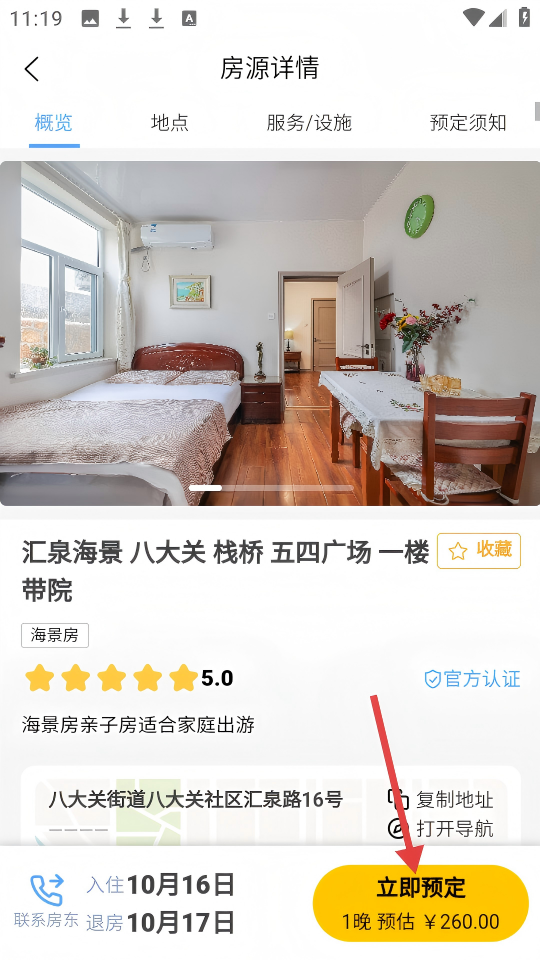 3、在房源详情页,确认房源信息后,点击【立即预定】按钮。