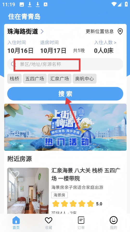 1、在首页,设置好入住时间、退房时间和入住人数后,在搜索框输入关键词,点击【搜索】按钮查找房源。