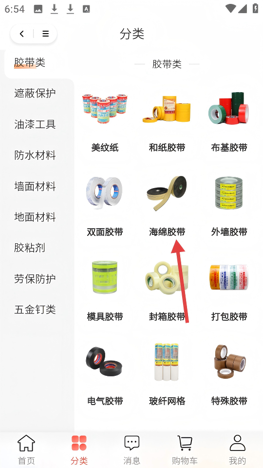 2、在分类页面,点击【海绵胶带】,查看该类胶带商品。