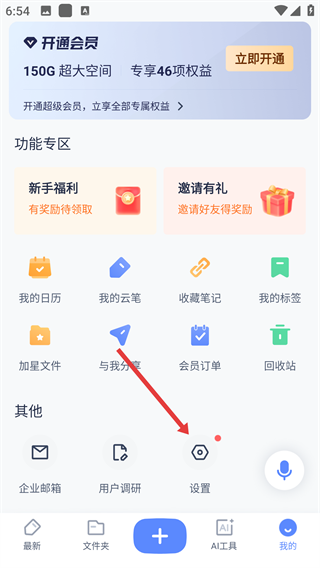 1、进入有道云笔记【我的】页面,找到【设置】入口,点击进入便可开展后续操作。