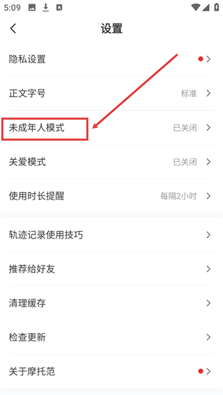 3、在【设置】页面,选择【未成年人模式】选项并点击,进入未成年人模式的功能说明界面。
