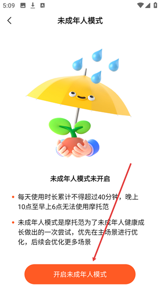 4、在【未成年人模式】页面,点击【开启未成年人模式】按钮,即可启用该模式限制使用时长等功能。