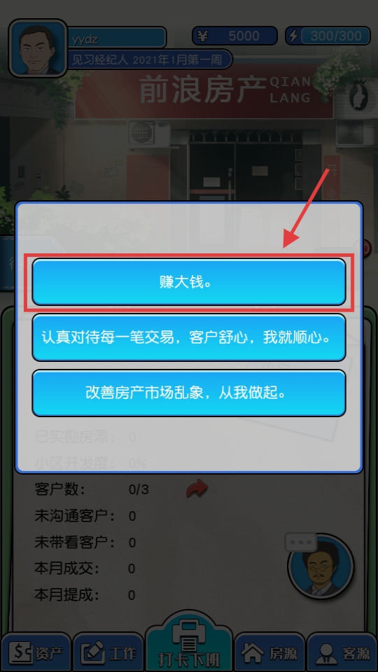 1、进入游戏后选择【赚大钱】选项开启经纪人之旅,后续可通过任务积累客户数与成交数据提升业绩。