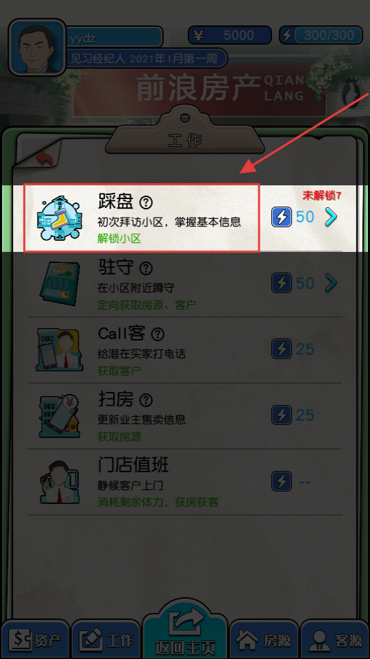 3、在【工作】界面选择【踩盘】任务,消耗50点体力可初次拜访小区并掌握基础信息解锁新小区。