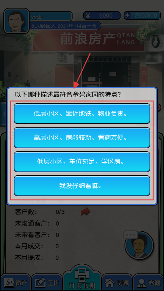4、遇到【金碧家园】特点的选择题时,需根据踩盘信息选准确选项,避免选错影响后续任务进度。