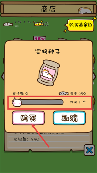 4、选择【宝妈种子】后,点击【购买】按钮消耗【450-白鲟鱼】获取种子,用于田园种植培育猫咪。