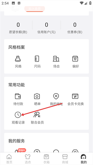 2、在个人中心的常用功能区域,点击【观看记录】选项。
