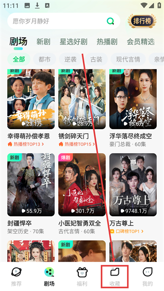 1、在【剧场】页面,点击底部【收藏】按钮可进入收藏页面。