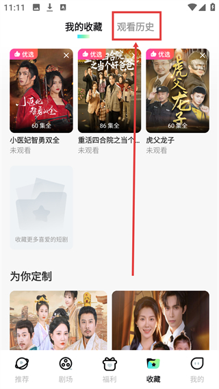 2、在【收藏】页面,点击顶部【观看历史】选项,即可切换到观看记录页面,查看已观看的剧集。
