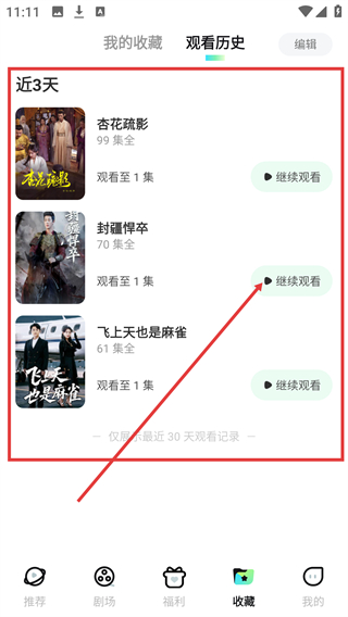3、在【观看历史】页面,能看到近3天的观看记录,点击【继续观看】可恢复播放。
