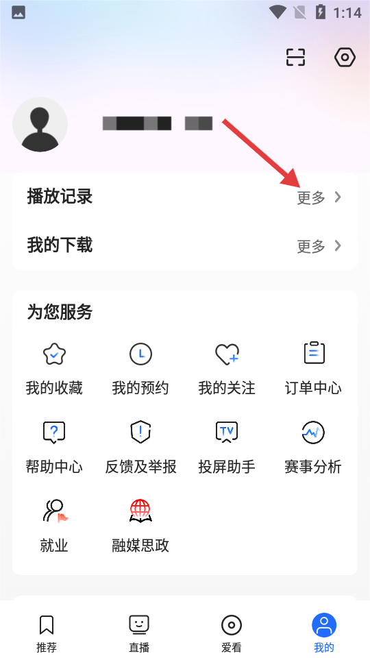 2、在个人中心页面点击【播放记录-更多】,进入历史记录页面。