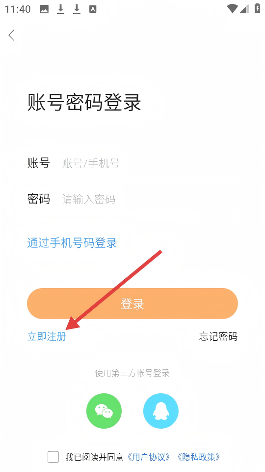 3、在账号密码登录页面,点击【立即注册】可进入注册流程。