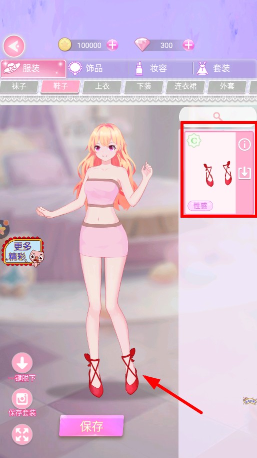 2、在鞋子栏,选择红色系带舞鞋,为角色换上,增添时尚感。