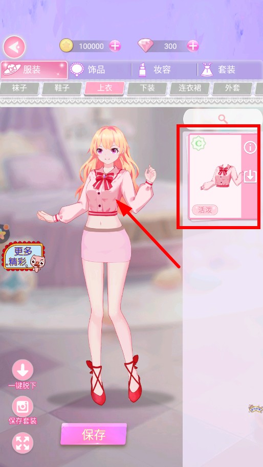 3、接着挑选带大蝴蝶结的粉色上衣,搭配舞鞋,丰富角色上装造型。