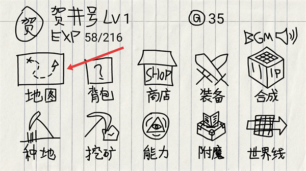 1、在主界面选择【地图】功能,角色为【贺井号-Lv1】,当前【EXP-58/216】,开启关卡探索。
