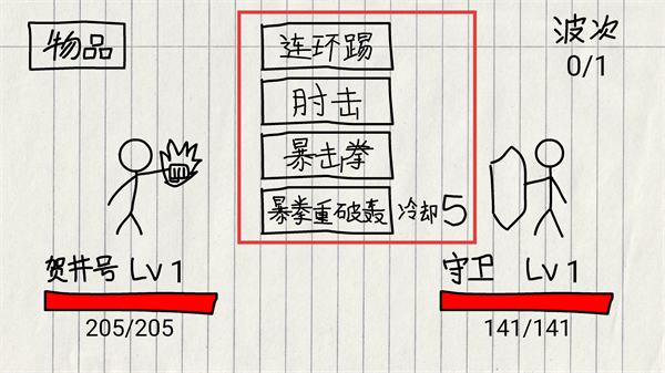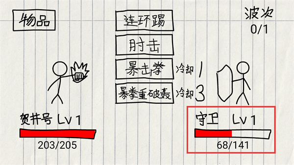 3、使用技能后,【守卫-Lv1】血量变为【68/141】,角色血量【203/205】,继续战斗直至胜利。