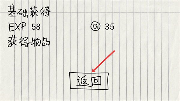 4、关卡完成后获得【EXP-58】与【35-货币】,点击【返回】回到主界面继续探索。