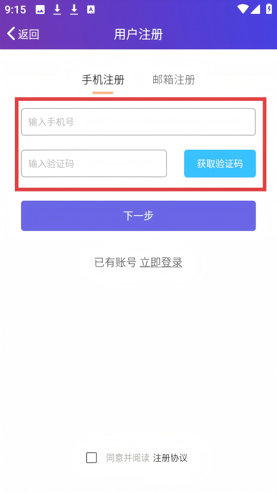4、进入【用户注册】的【手机注册】页面,需输入手机号、验证码之后可点击【下一步】继续注册。