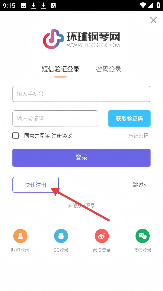 3、在环球钢琴网登录界面,若要注册,可点击【快速注册】按钮进入注册流程。