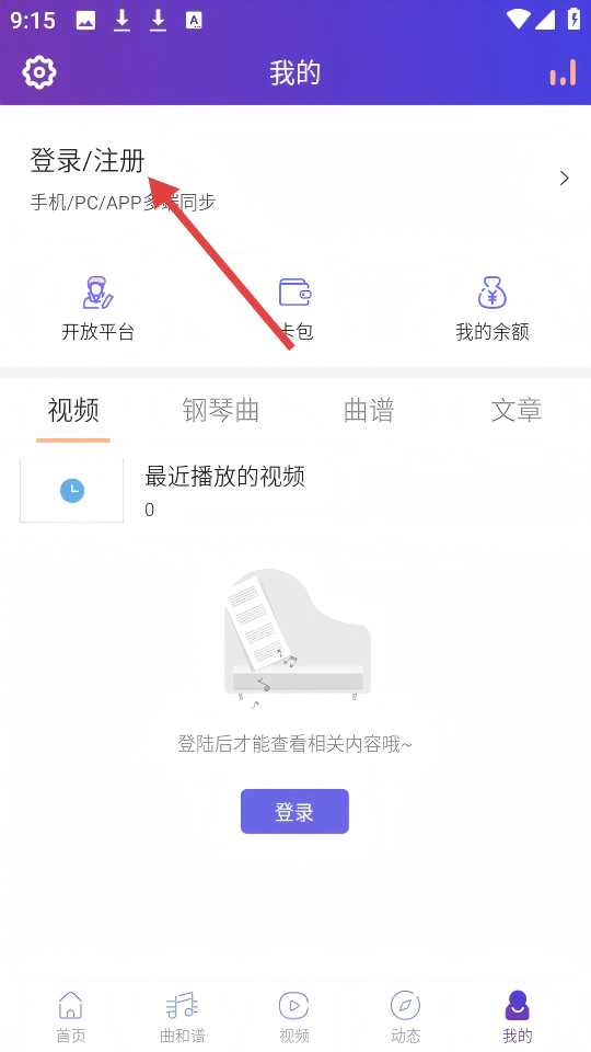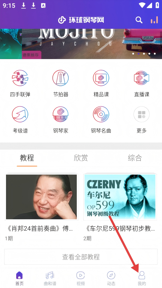 1、在环球钢琴网首页,点击底部导航栏的【我的】按钮。