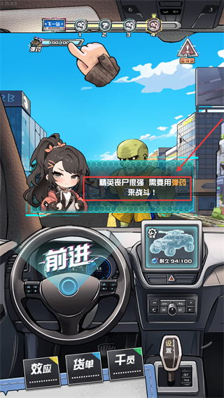 1、触发战斗提示后,使用炮台清理僵尸,点击方向盘【前进】按钮,推进物资运输的流程。