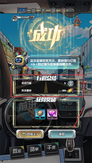 3、完成任务后查看行程总结,选择【领取】奖励,积累物资用于基地的快递店或超市建设。