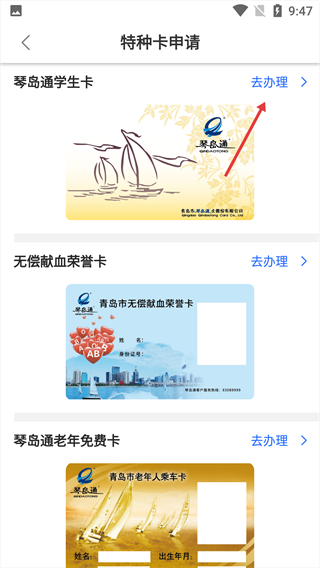 2、点击【琴岛通学生卡】板块的【去办理】按键。