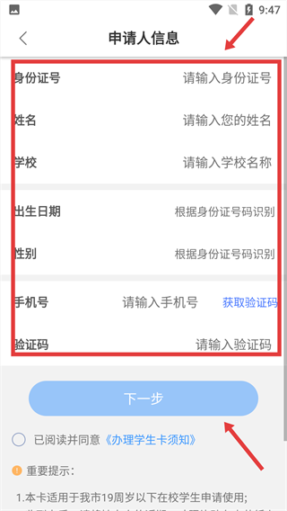 4、填写【身份证号】、【姓名】、【学校】等信息后,点击【下一步】提交申请。