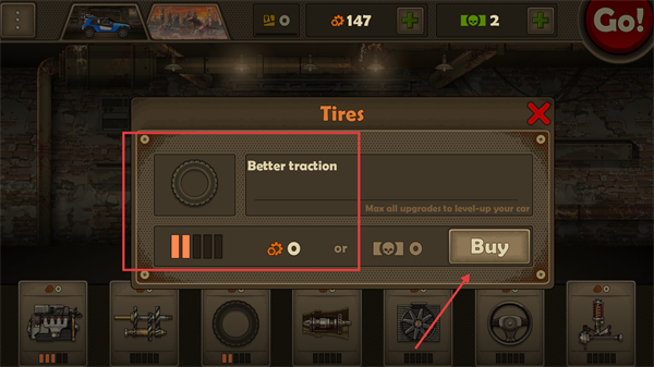 1、在车辆升级界面,点击【Buy】购买轮胎等部件的升级,提升战车的牵引力,为末日驾驶挑战做好准备。