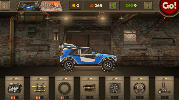 2、点击【Go!】进入游戏场景,驾驶升级后的战车在末日城市中展开行驶挑战。