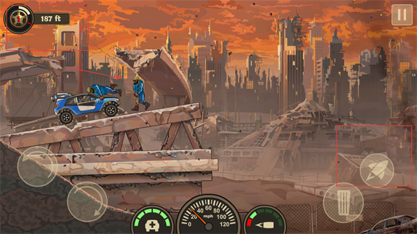 4、关注行驶距离的计量,同时可利用导弹等道具消灭障碍物和敌人,推进游戏进程。