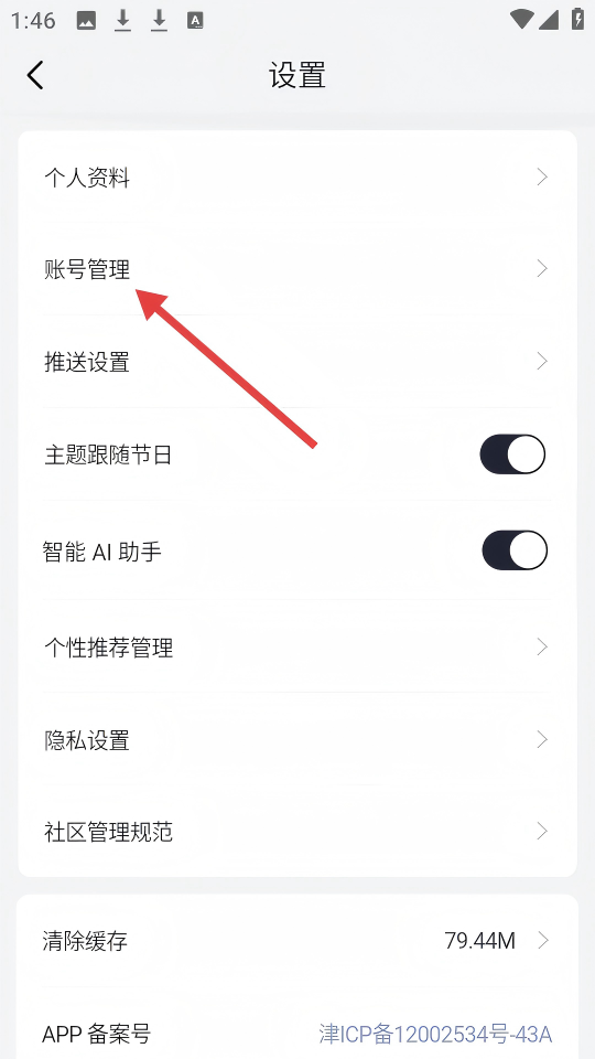 4、在设置页面,点击【账号管理】,进入账号管理页面。