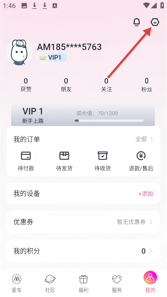 2、在【我的】页面,点击右上角设置图标,进入设置页面。
