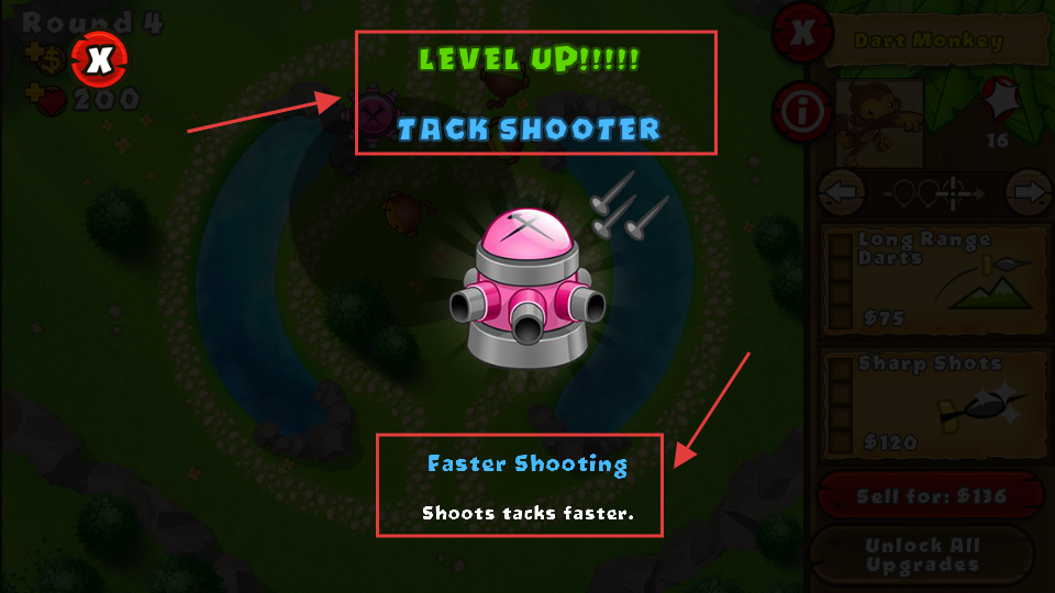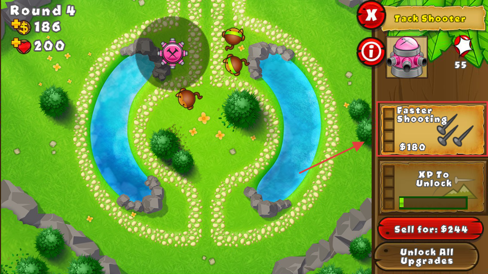 4、战斗中积累足够金币后,点击【FasterShooting】升级塔防提升拦截气球效率。