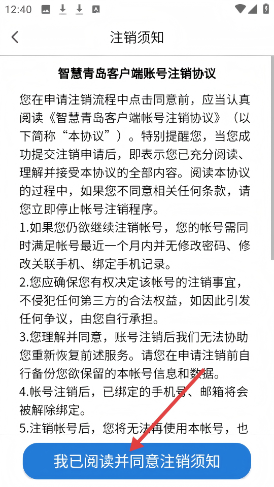 4、在【注销须知】页面,点击【我已阅读并同意注销须知】,可继续账号注销。