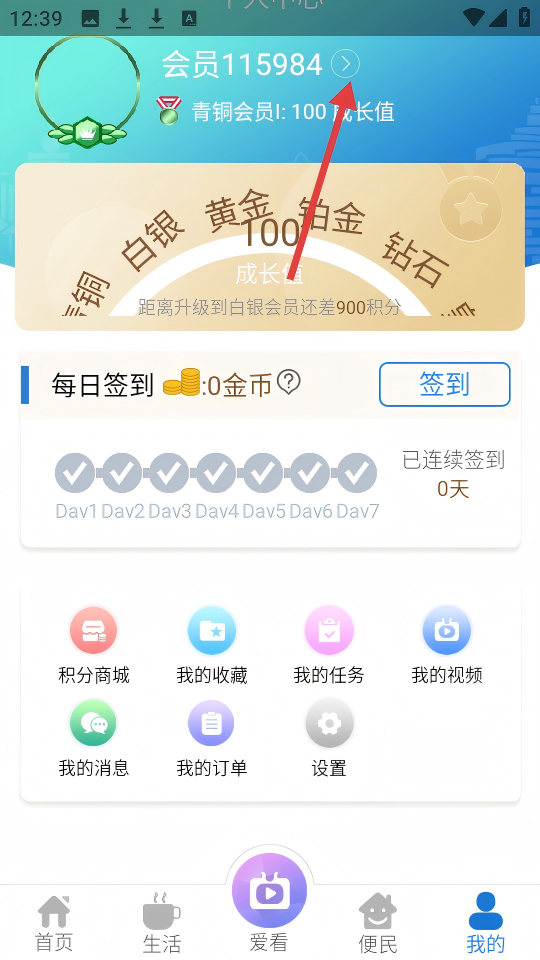 2、在【我的】页面,点击会员名称旁的箭头,进入【用户信息】页面。