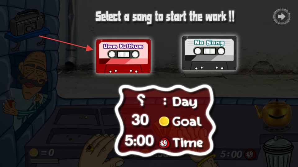 2、选择音乐磁带,设置背景音乐,开启一天的经营工作,目标在5:00内赚取30金币。