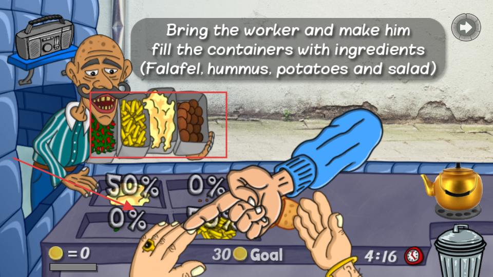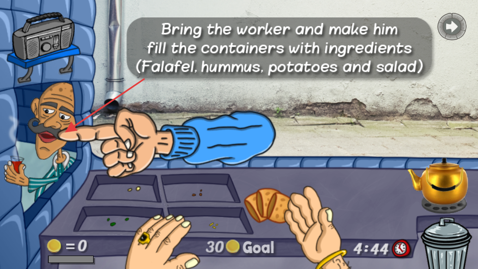 3、根据提示召唤工人,让其填充容器,准备法拉费等食材,为制作餐品做准备。