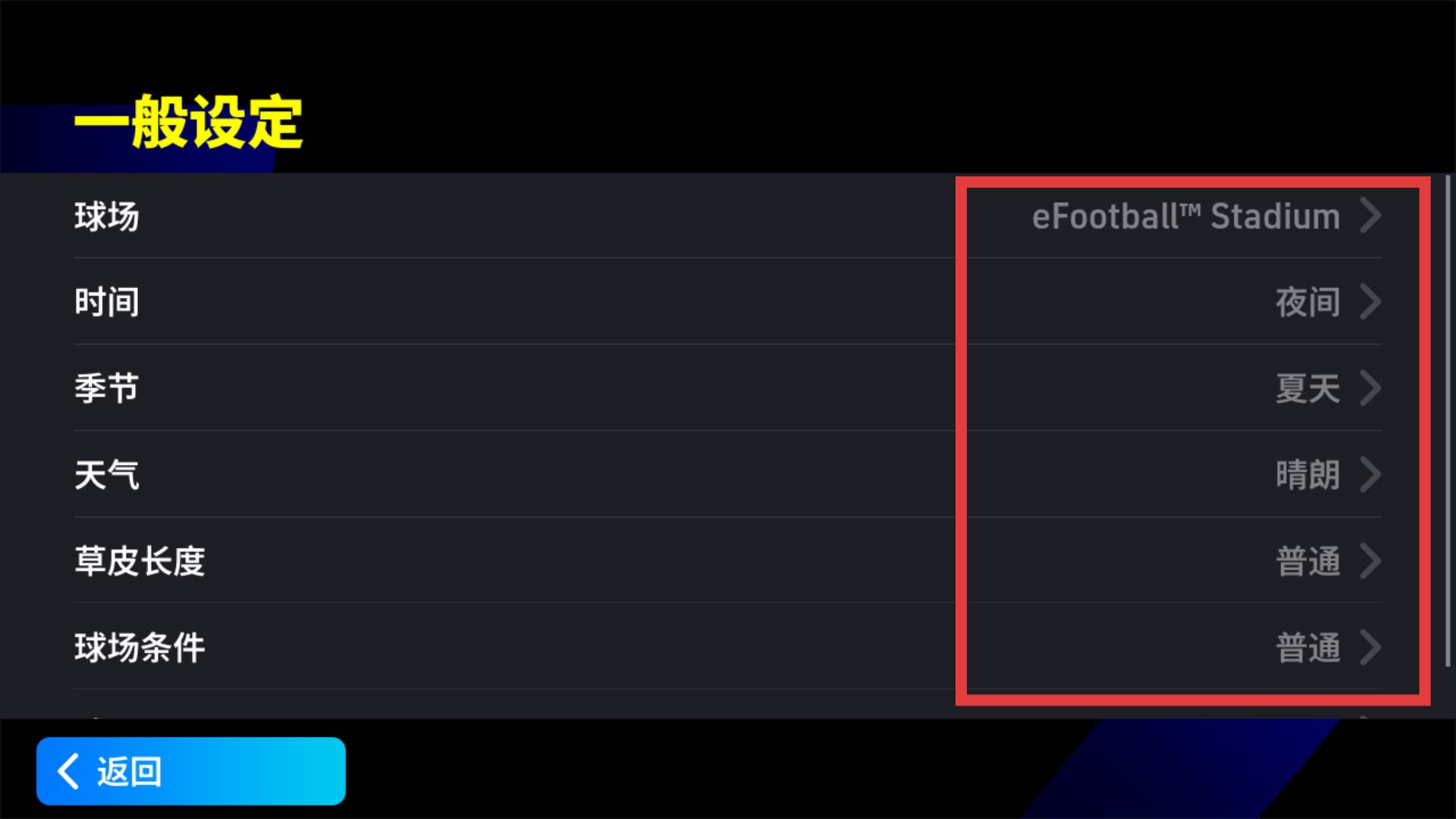 1、进入游戏设置的一般设定界面,可根据喜好调整时间、季节等球场相关参数,打造个性化比赛环境。
