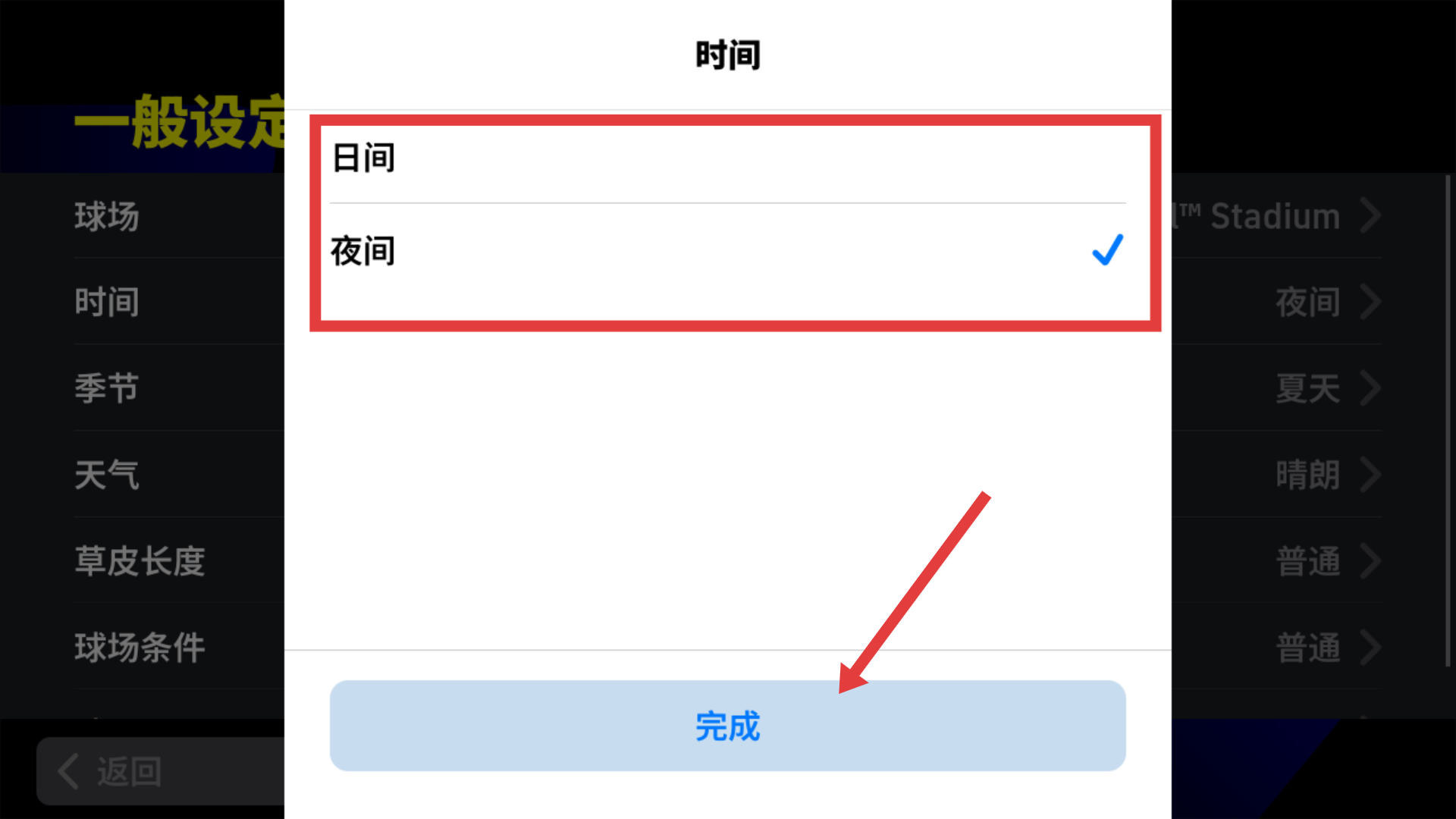 2、在时间设置选项中,选择日间或夜间模式后点击完成,即可应用所选时间设定,为比赛增添不同氛围。