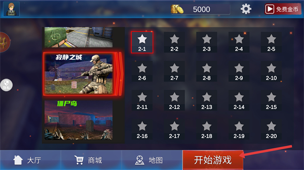 1、选择【寂静之战】关卡,点击【开始游戏】按钮,进入该关卡的射击对战挑战。