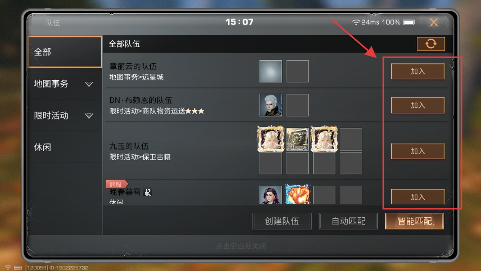 3、在队伍列表中,选择目标队伍,点击【加入】。